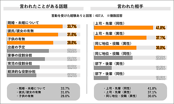 そこでアンコンシャス・バイアスな言動を受けた経験ありと回答した407人に「言動を受けた話題」を聞くと、「既婚・未婚について」33.7%、「彼氏/彼女の有無」31.0%、「子供の有無」28.0%が上位。「言動を受けた相手」では、「同性の上司/先輩」41.8%がやや多く、「異性の上司/先輩」37.1%、「異性の同じ地位/役職」30.0%が上位だった。“同性の部下に対して、結婚の話題を振る”というのがありがちのようだ。