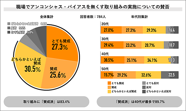 最後に「職場でのアンコンシャス・バイアスをなくす取り組みの賛否」を聞くと「賛成派」83.4%と圧倒的に多い。年代別では40代の「賛成派」89.7%が最多だった。