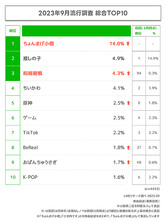 前回6月の調査で1位だった「推しの子」は総合2位。「呪術廻戦」がそれに続き3位だった。4位以降では、「ちいかわ」「おぱんちゅうさぎ」といったキャラクターがランクイン。また、フィルターやエフェクト加工せずにリアルな日常を投稿できるSNSとして話題の「BeReal」が8位に入った。
