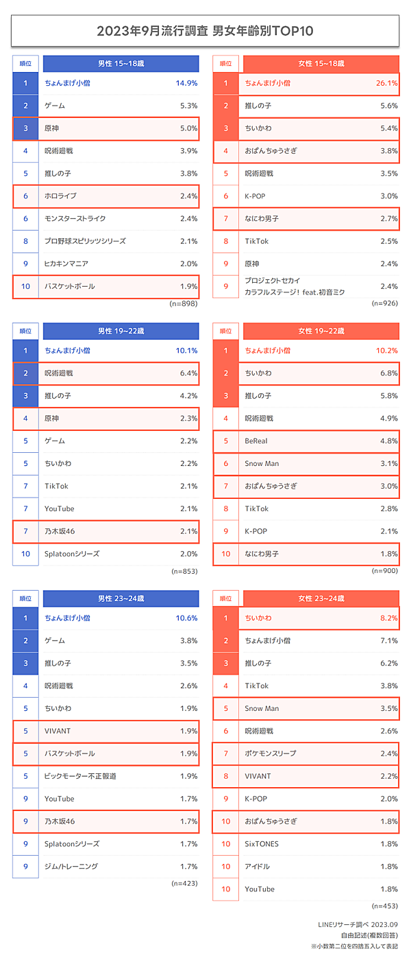 男女年齢別にみると、総合1位の「ちょんまげ小僧」は、女性23~24歳のみ「ちいかわ」が1位だが、その他の性別・年代ですべて1位になった。総合2位の「推しの子」は男性15~18歳を除くすべての年代で上位3位までに入っている。その他、男性15~18歳と男性19~22歳では、「原神」が上位5位に入っている。