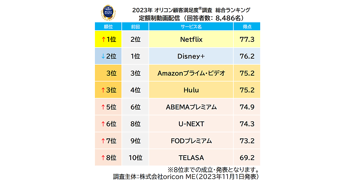 総合ランキングでは、「Netflix」が2020年以来3年ぶり5度目の1位を獲得した。前年1位の「Disney+」は2位にランクイン。3位は「Amazonプライム・ビデオ」となった。
