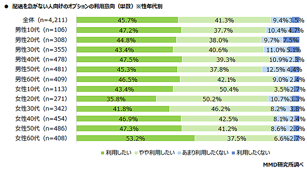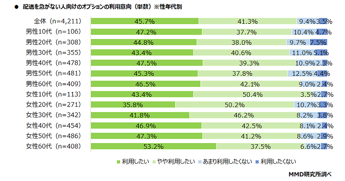 そこで4,211人に「配送を急がない人向けのオプション」(通常配送より数日延びるが、特典がある)の利用意向を聞くと、「利用したい」45.7%、「やや利用したい」41.3%で、計9割近くが利用意向を持っていた。性年代別では「女性10代」93.8%がもっとも多く、「女性60代」90.7%、「女性40代」89.4%が続く。「男性60代」も88.6%と高めだ。