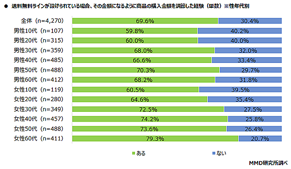 あわせて「送料無料ラインが設けられている場合、その金額になるように商品の購入金額を調節した経験があるか」を聞くと、「ある」と回答したのは69.6%。これも「女性60代」79.3%、「女性40代」74.2%、「女性50代」73.6%と女性・高齢者が上位を占めた。