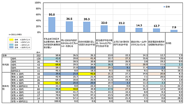 年代別では特に受け手となりそうな40~50代が多く、40代では69.8%、50代では59.1%が「集中力が途切れ業務効率が悪い」と回答している。一方20代は「自分の知識で正しく回答できるか不安」41.4%、「上司にうまく取り次ぎできるか不安」27.3%が比較的高い。