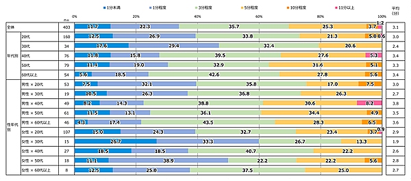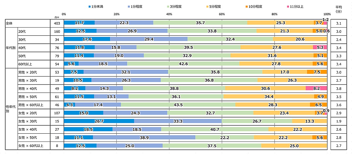 1日1件以上電話対応していると回答した403人に「1コールあたりかかる時間」を聞くと、全体では「3分程度」35.7%が最多。加重平均で算出すると「3.1分」となった。さらに年代別で見ると、もっとも長いのが40代・60代以上の「3.4分」。もっとも短いのは30代の「2.4分」だった。