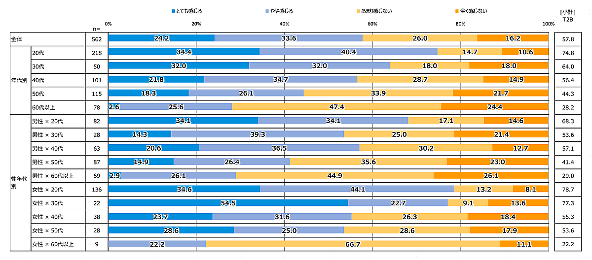 まず「電話(電話業務)に対して苦手意識を感じていますか」と聞くと、「とても感じる」24.2%、「やや感じる」33.6%で、計57.8%が苦手意識を持っていた。年代別で見ると若い世代ほど高く、30代で64.0%、20代では74.8%にまで達する。20代・30代での平均は72.7%となる。