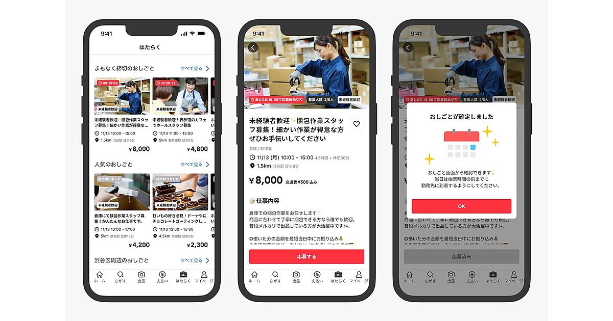 近年の人手不足と、スポットワークの需要増に対応。仕事を探す「クルー」と、求人を出す「パートナー」が出会い、気軽に挨拶しあえる世界観を示すために名付けた。フリマアプリのメルカリのユーザーが同アプリを通じて仕事を簡単に探せる体験を提供。本人確認済みのメルカリのアカウントがあれば、新たな情報入力なく仕事に応募できる。