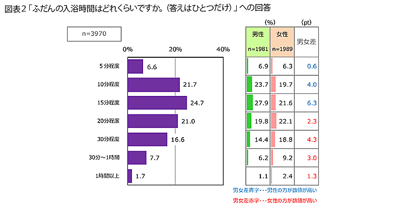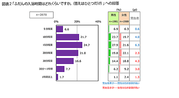 あわせて「ふだんの入浴時間」を聞くと、「15分程度」24.7%が最多で、「10分程度」21.7%、「20分程度」21.0%がそれに続く。「30分程度」「30分~1時間」「1時間以上」の合計は26.0%で、全体の4分の1にとどまる。