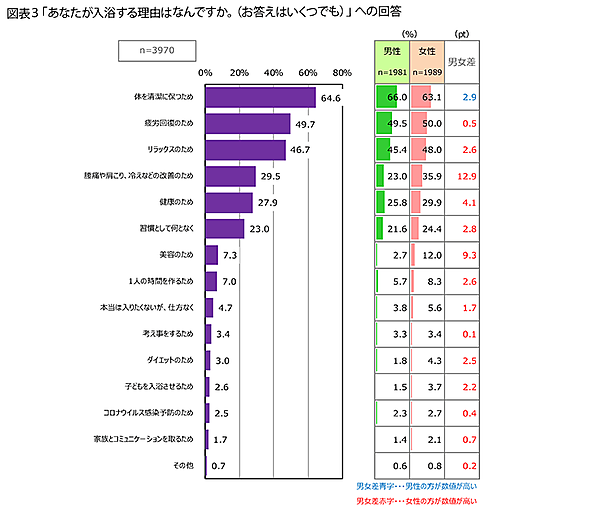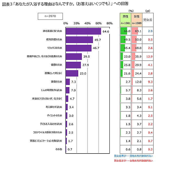 「入浴する理由」では「体を清潔に保つため」64.6%が特に多く、「疲労回復のため」49.7%、「リラックスのため」46.7%がそれに続いた。