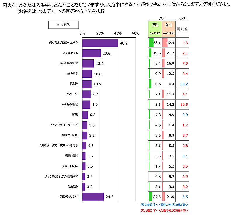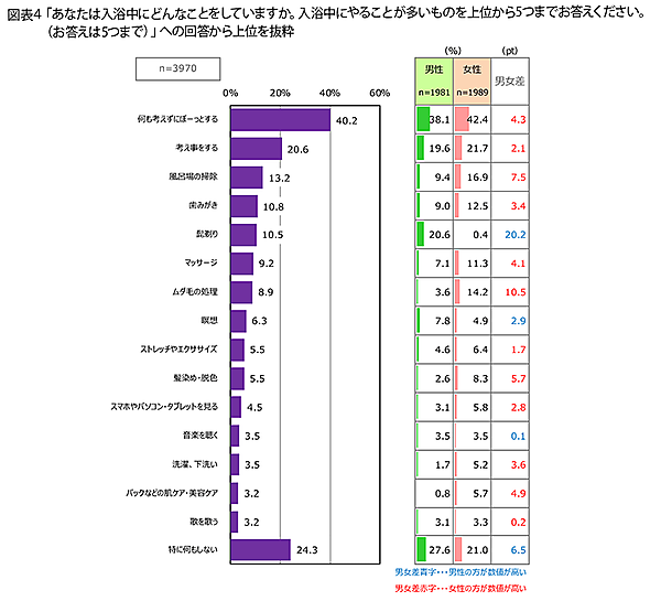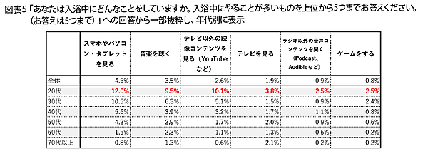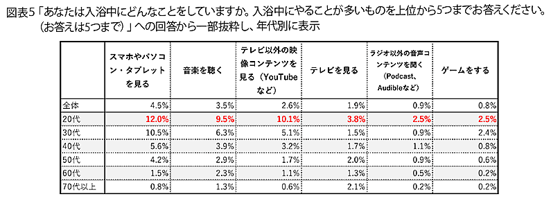 入浴中は「何も考えずにぼーっとする」人が多いが、若年層のスマホ持ち込み率があがっている