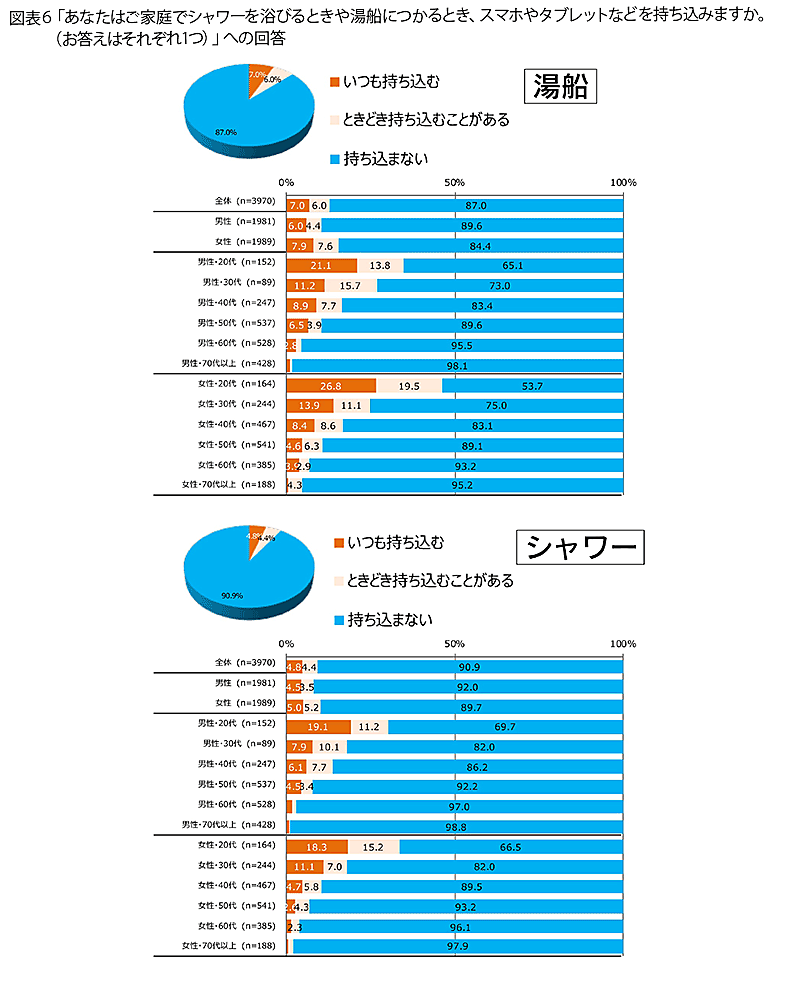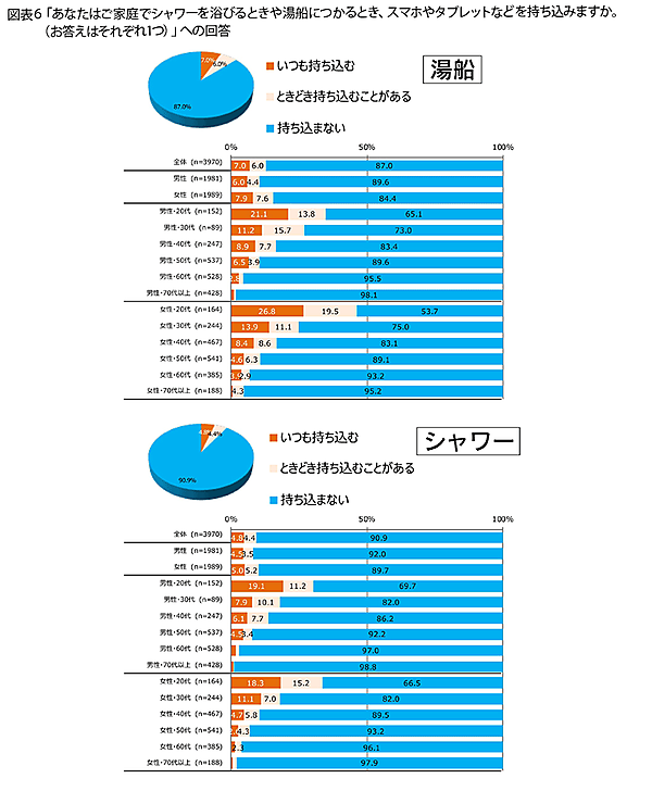 「シャワーを浴びるときや湯船につかるとき、スマホやタブレットなどを持ち込むか」と聞くと、湯船につかるときだと「いつも持ち込む」7.0%、「ときどき持ち込むことがある」6.0%。シャワーを浴びるときだと「いつも持ち込む」4.8%、「ときどき持ち込むことがある」4.4%となった。