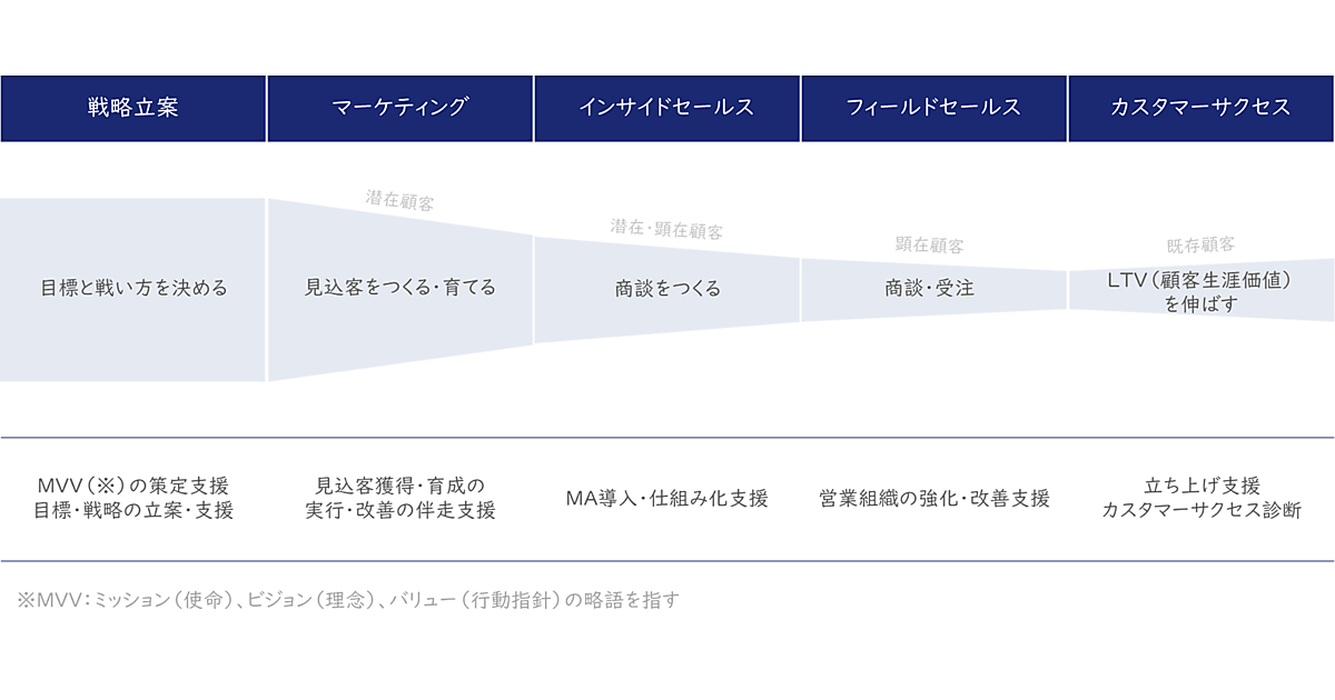 コンサルティングサービスは、目標と戦い方を決める戦略立案から、見込み客をつくる・育てるマーケティング、商談をつくるインサイドセールス、商談・受注のフィールドセールス(外勤営業)、LTV(顧客生涯価値)を伸ばすカスタマーサクセスまでサポートする。コンサルティングに加え、各種マーケティングソリューションも提供する。