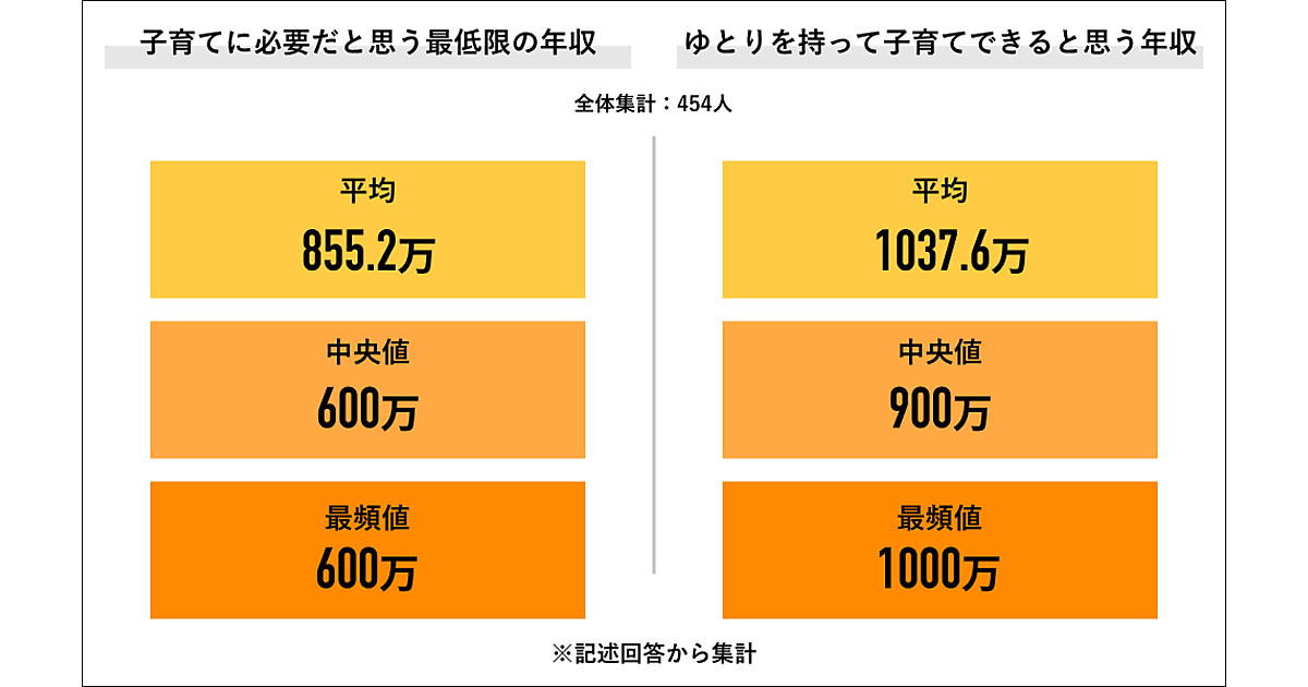 また、子1人に対して必要だと思う最低限の年収額は平均855.2万円、ゆとりを持って子育てができると思う年収は平均1037.6万円と、理想と現実の間にギャップがあることがわかった。
