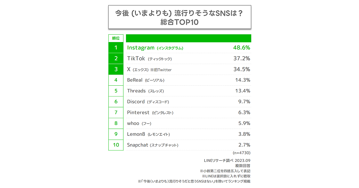 LINEが運営するLINEリサーチは、Z世代が考える「今後(いまよりも)流行りそうなSNS」に関する調査結果を発表した。四半期ごとに実施している若年流行調査で、日本全国の15~24歳男女が回答している。今回(2023年9月期)の有効回収数は4,730人。