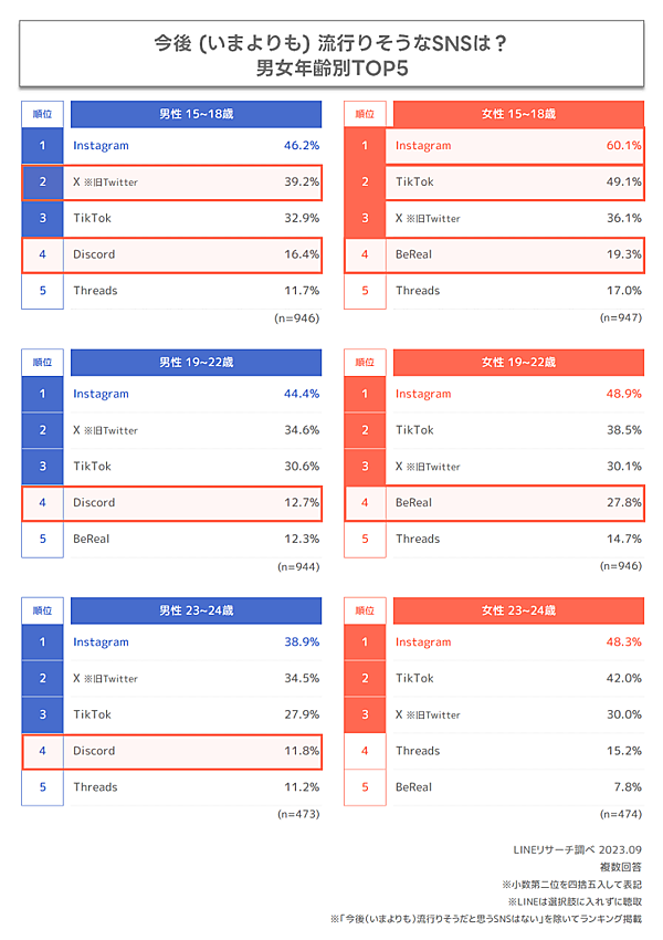 男女別で見ると、1位のInstagramは女性15~18歳が高い。またXは男性の支持が高かった。男性はすべての年齢層でDiscordが4位にランクインしておりBeReal人気を上回っている。