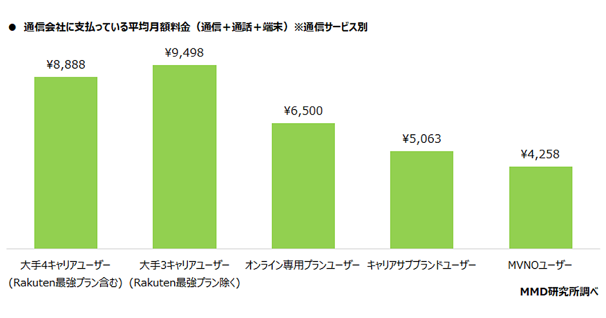 まず、通信会社に支払っている平均月額料金(通信+通話+端末)を聞くと、大手4キャリアでは8,888円、「Rakuten最強プラン」を除いた大手3キャリアでは9,498円となった。また、オンライン専用プランユーザーは6,500円、キャリアサブブランドユーザーは5,063円、MVNOユーザーは4,258円と差が見られた。