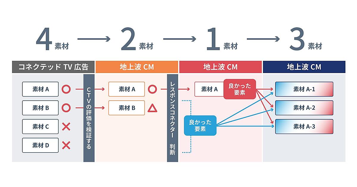動画広告で4つの素材を出稿した際、電通が開発した効果分析ツールを使ってコネクテッドテレビを横断して効果を検証し、2素材に絞り込む。この2素材を地上波で放映し、効果を調べて1素材だけ放映を続ける。効率悪化などに備え、元々の4素材から良かった要素と悪かった要素を抽出して新しい素材を複数作成。素材を統計的に改良して効果を継続的に維持させる。