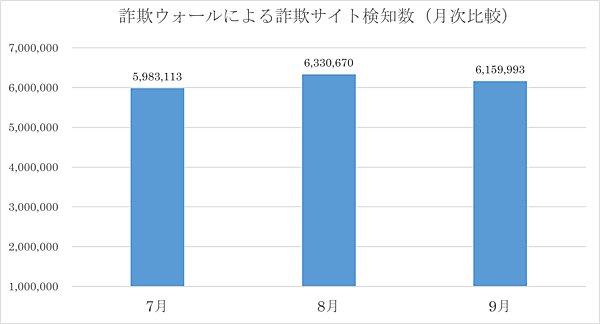 それによると、2023年9月における「詐欺ウォールによる詐欺サイト検知数」は615万9,993件で、先月に続き600万の大台にのっている。