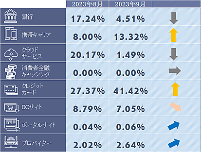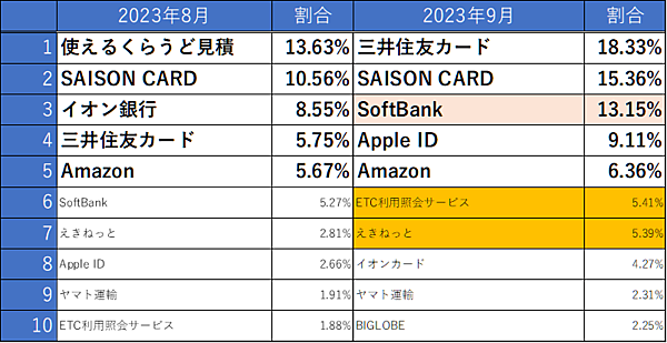 フィッシングサイトをブランドで見ると、8月に突如1位となった「使えるくらうど見積」はトップ10圏外に消えて、「三井住友カード」が18.33%で1位になった。以下「SAISON CARD」15.36%、「Softbank」13.15%など定番のブランドが上位だった。