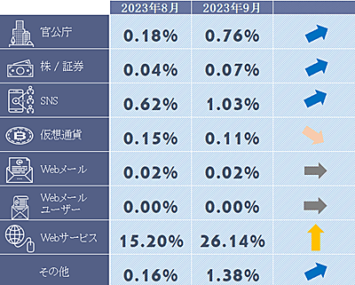 セキュリティソフト「Internet SagiWall」(詐欺ウォール)を提供するBBソフトサービスは、2023年9月度のインターネット詐欺リポートを発表した。詐欺ウォールを利用しているユーザーのアクセス数値を集計し、詐欺サイトの動向を分析した内容となっている。