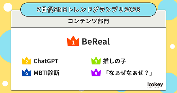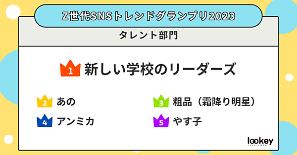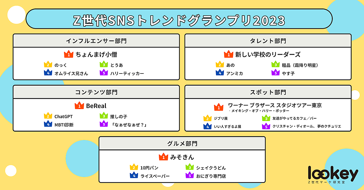 テテマーチのZ世代マーケ研究室「lookey」(ルーキー)は、「Z世代SNSトレンドグランプリ2023」を発表した。今年のSNSトレンドについて「インフルエンサー部門」「タレント部門」「コンテンツ部門」「スポット部門」「グルメ部門」の5部門について、19歳~23歳のZ世代400人が回答、その結果をランキング化している。