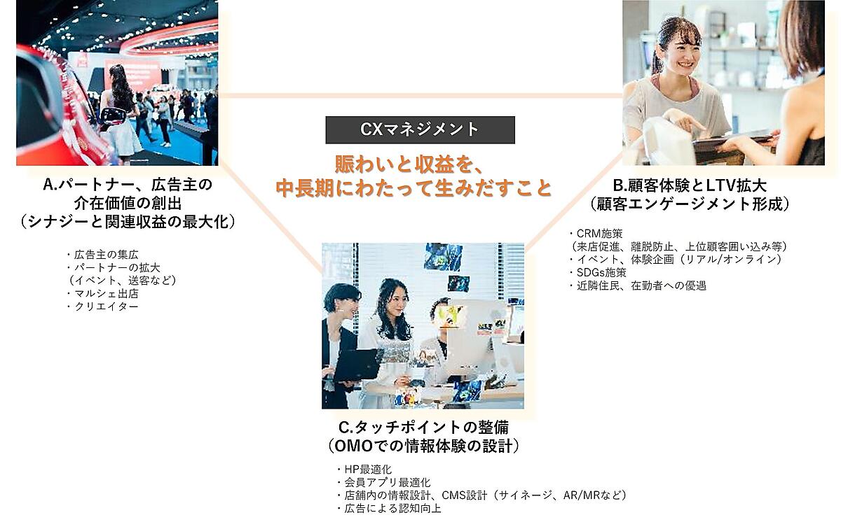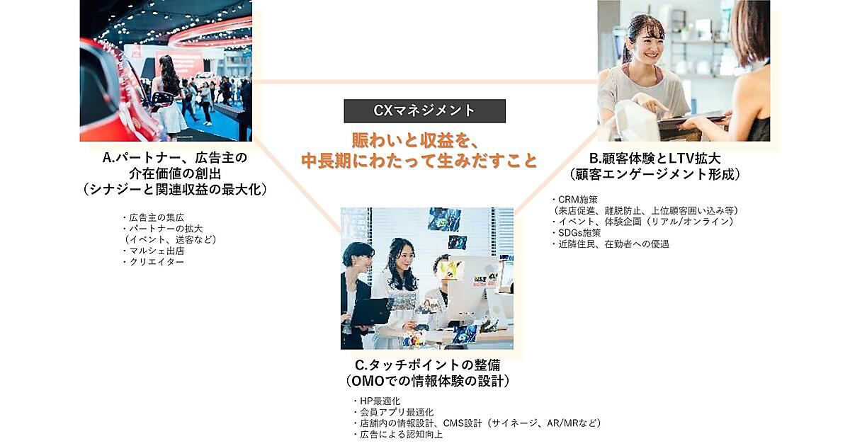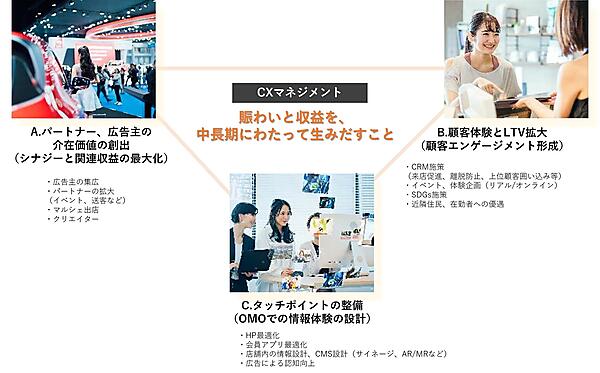 CXMは「顧客体験管理」と訳され、顧客の満足度や体験重視のマーケティング戦略。CXMを取り入れた施設運営で来訪する理由や再来のきっかけをつくり、ファンやコミュニティを増やす好循環をつくる。リアルとデジタルを掛け合わせた体験設計や、イベントとデジタルサイネージを組み合わせた多面的な情報発信、クリエイターとの接点づくりとコミュニティ創出、東急不動産の他施設のメディアとセットでの広域連携施策を予定している。