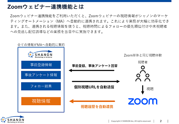 マーケティングソリューション開発・コンサルティングのシャノンは、同社のマーケティングオートメーション(MA)ツール「SHANON MARKETING PLATFORM(SMP)」と、米国Zoomのウェブセミナー(ウェビナー)ツール「Zoom Webinars」の連携を始める、と11月27日発表した。ウェビナーの運用効率化と視聴情報を生かしたマーケティングが容易に可能になる。