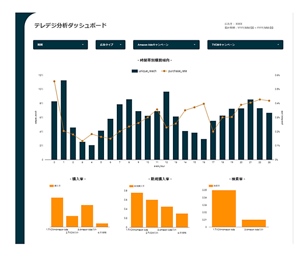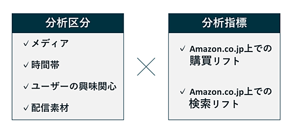 Amazon.co.jpとの連携では、Amazon広告(Amazon Ads)に対する消費者の行動を含む各種インサイト(深層心理)を組み合わせて分析。テレビCMやAmazon Adsへの接触がAmazon.co.jpでの購買・検索行動に与える影響を可視化する。購買・検索は、メディア▽時間帯▽ユーザーの興味関心▽配信素材--の区分で分析。テレビCMと連動したデジタル広告配信にもつなげられる。