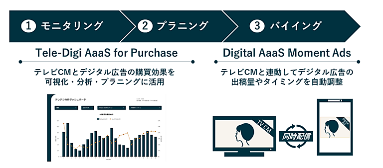 Tele-Digi AaaS for Purchaseは、購買に関するさまざまなデータを統合。オンライン・オフラインでの購買やカスタマージャーニー(購買までのプロセス)にテレビ・デジタル広告がどう影響しているか明確にして統合管理し、最適な広告運用を図る。モニタリングからプランニング、バイイング(テレビバイイングやデジタルターゲティング)までの3領域を最適化する。