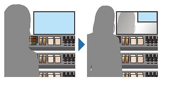 映像と鏡の切り替えの動作パターンのカスタマイズもでき、通常は鏡にして人が近付くと鏡+映像にしたり、人が近くにいない時に全画面の映像と鏡+映像を交互に入れ替えたりできる。大きな鏡とデジタルサイネージの両方の設置が難しい売り場でも導入が可能。鏡の端の映像を通して商品やブランドの情報を伝えることで、顧客の関心を高められる。