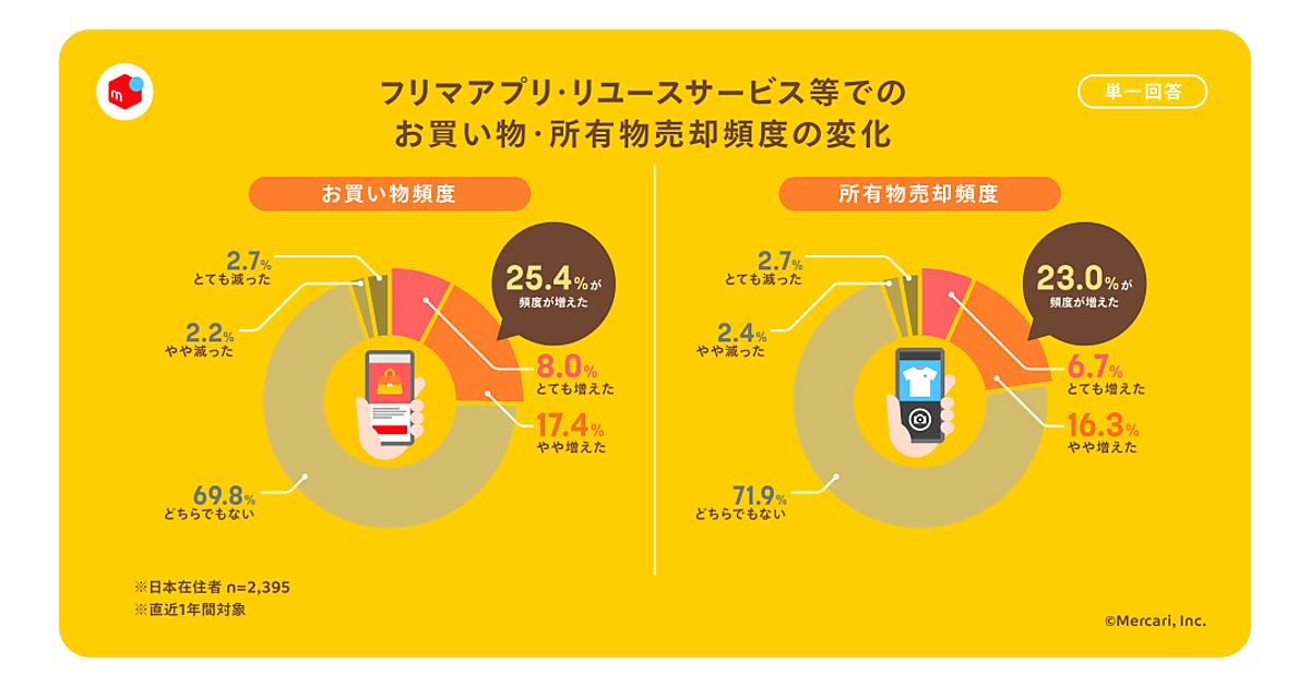 そこで「直近1年間での、各種リユースサービスの活用」(買い物をしたか、所有物を売却したか)を聞くと、リユース品の買い物は「とても増えた」8.0%、「やや増えた」17.4%と回答。所有物を売る頻度も「とても増えた」6.7%、「やや増えた」16.3%と回答。どちらも「とても減った」「やや減った」を大きく上回った。
