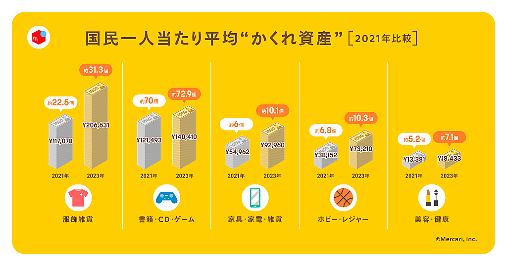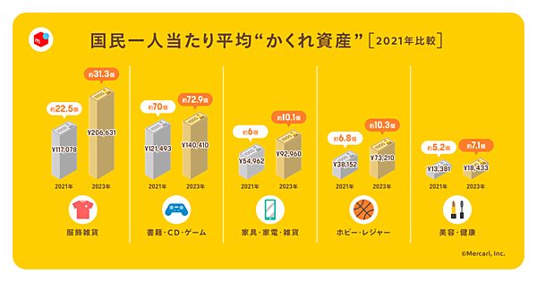 “かくれ資産”の内訳比率は、「服飾雑貨」38.9%がもっとも大きく、「ゲーム・書籍」26.4%、「家具・家電・雑貨」17.5%などを上回っている。どの分類も保有数=かくれ資産は増加しており、不要品の1人あたり平均保有数は前回調査(2021年)の「110.5個」から「131.7個」と約1.2倍に増加。特に服飾雑貨は約1.4倍に増加している。