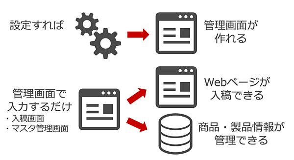 管理画面ビルダーで設定することで、入稿画面やマスター管理画面が利用でき、新しいコンテンツページや、データベースの管理画面の作成・運用が自社で可能になる。迅速なページの追加や、運用コストを抑えながら常に新しい情報が発信でき、企業のマーケティングの自由度が高まるという。