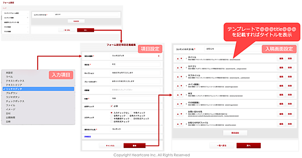 CMSは管理画面を通じてウェブサイトを作成・管理・運用するシステムだが、専門知識のない部門がページ更新できるように、外部制作会社や専門知識を持つ担当者が都度入稿用の画面を作成することが多い。そのため、直感的にオリジナルの入稿画面が作成可能な管理画面ビルダーを開発した。