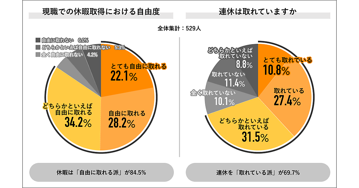まず「休暇は自由にとれるか」「実際に休暇はとれているか」を聞くと、「とても自由に取れる」22.1%、「自由に取れる」28.2%、「どちらかと言えば自由に取れる」34.2%と、8割超が“自由に取れる”とした。一方実際の連休の取得有無は、「とても取れている」10.8%、「取れている」27.4%、「どちらかといえば取れている」31.5%と7割ほどに下がる。残る3割ほどは休暇が自由に取れていない。