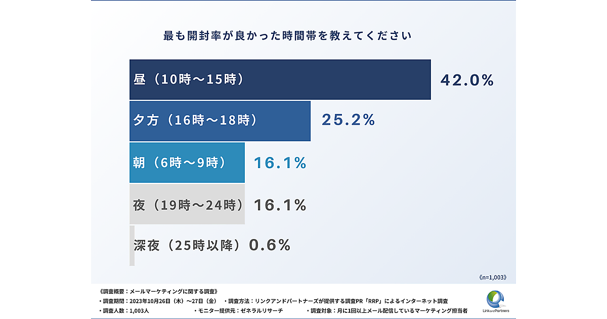 調査PR「RRP」(Research Release PR)を提供するリンクアンドパートナーズは、「メールマーケティング」に関する調査結果を発表した。月に1回以上メール配信しているマーケティング担当者1,003人が回答している。