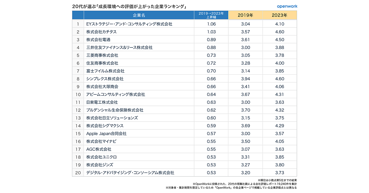 オープンワークは、20代が選ぶ「成長環境への評価が上がった企業ランキング」の調査レポートを発表した。「20代 成長環境」のスコアについて、2019年と2023年を比較し、上昇幅が大きい企業をランキング化している。
