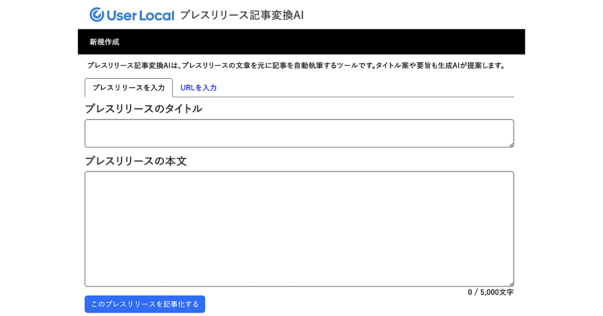 AI(人工知能)・ビッグデータ分析技術開発のユーザーローカルは、プレスリリースを元にしてニュース記事を自動で執筆する生成AIサービス「プレスリリース記事変換AI」の提供を始める、と12月5日に発表した。任意のプレスリリースの内容から、生成AIアルゴリズム(計算手順)によってニュース記事をすばやく自動生成する。会員登録は不要で、メディア企業や個人ライターを問わず無料で利用できる。
