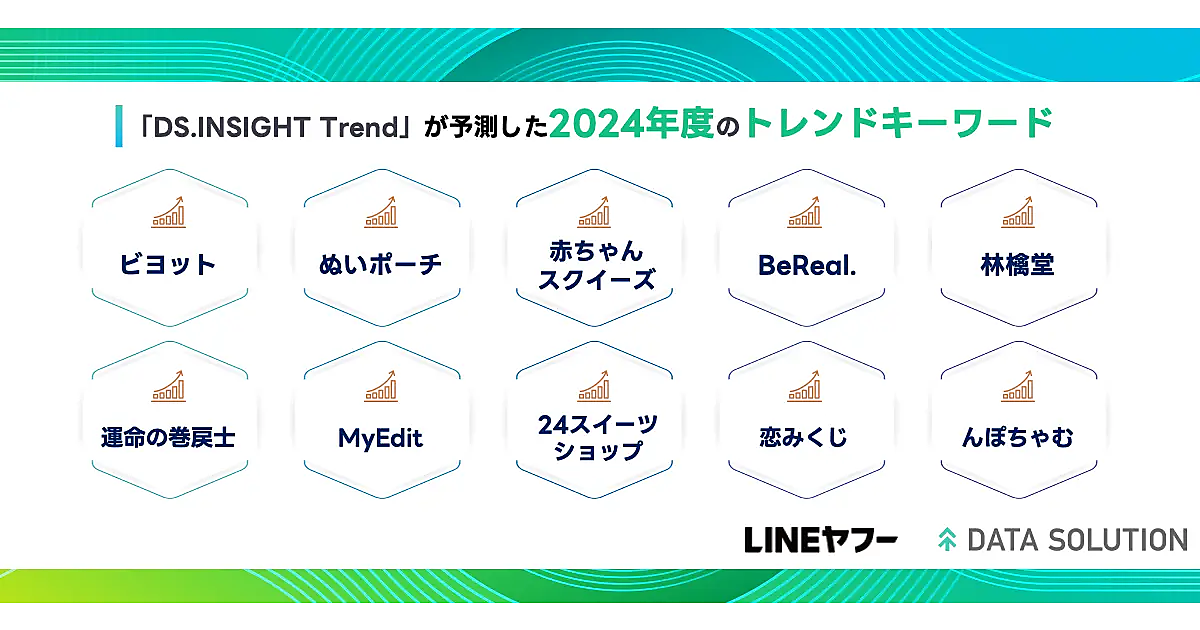 LINEヤフーが提供する「ヤフー・データソリューション」は、2024年にヒットが期待されるキーワード10点を発表した。Yahoo! JAPANのビッグデータとAIを活用して「商品トレンドマップ」を構築し、2023年に流行る商品や事象を予測している。
