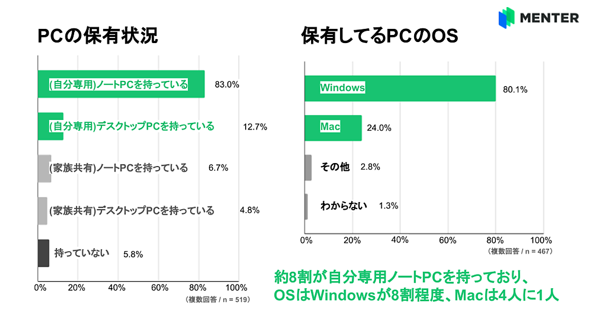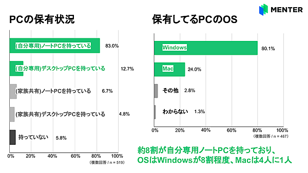 まず「PCの保有状況」を聞くと、「自分専用のノートPCを持っている」83.0%がほとんど、「自分専用のデスクトップPCを持っている」12.7%がそれに続いた。「いずれも持っていない」は5.8%だった。使用PCのOSシェアは「Windows」80.1%が多数派で、「Mac」は24.0%だった(複数台所有者が存在)。