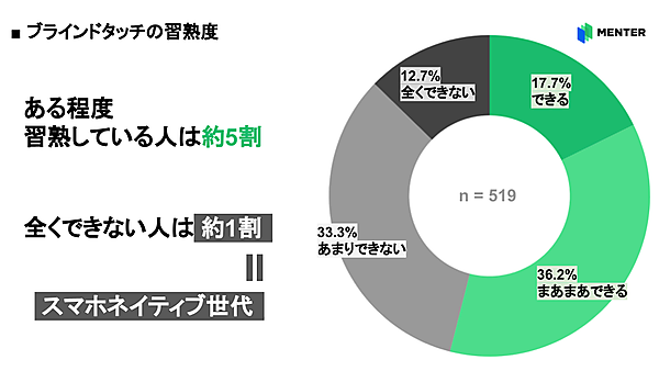 「タッチタイピング(ブラインドタッチ)」「マウス」「Office系ソフト(Word、Excel、PowerPointなど)」の習熟度を聞くと、「タッチタイピングができる」17.7%、「まあまあできる」36.2%で、過半数がタッチタイピングができるとした。