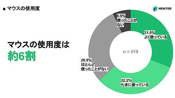 マウスについては「よく使っている」31.0%、「たまに使っている」32.2%だった。一方「ほとんど使ったことがない」29.9%、「使ったことがない」6.9%と、マウスを使っていない人が3割以上存在していた。