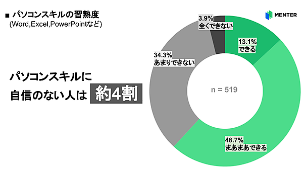 Word、Excel、PowerPointといったOffice系ソフトのスキルについて聞くと、「できる」13.1%、「まあまあできる」48.7%と約6割が“できる”と回答している。