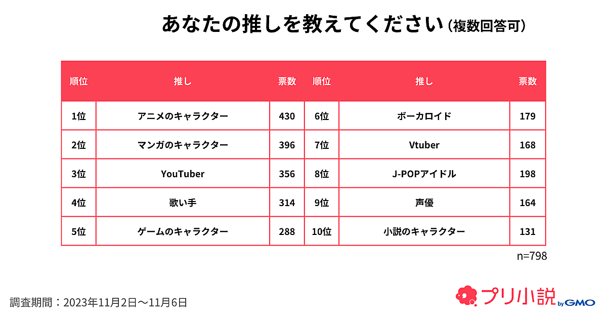 GMOインターネットグループのGMOメディアは、「推し活」に関する調査結果を発表した。同社が運営するチャット型小説サービス「プリ小説 byGMO」を利用している、中学生・高校生の女子806人が回答している。