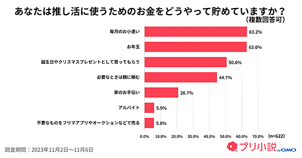 また「推し活に使うためのお金をどうやって貯めていますか?」でも「毎月のお小遣い」63.2%、「お年玉」63.0%が特に多い。「誕生日やクリスマスプレゼントとして買ってもらう」50.6%がそれに続く。