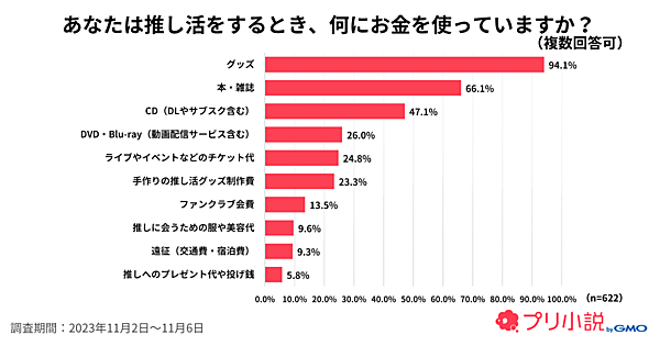 具体的に「推し活をするとき、何にお金を使っていますか?」と聞くと、「グッズ」94.1%が多いほか、「本・雑誌」66.1%、「CD(DLやサブスク含む)」47.1%が上位。「DVD・Blu-ray(動画配信サービス含む)」26.0%、「ライブやイベントなどのチケット代」24.8%、「手作りの推し活グッズ製作費」23.3%が、やや数字が下がりそれに続く。アニメやマンガのキャラが多いこともあり、美容代や遠征費は控えめだ。