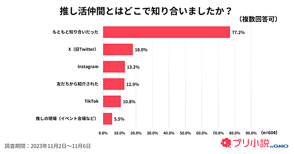 「推し活仲間」については、75.7%が「いる」と回答。どこで知り合ったかについては、「もともと知り合いだった」77.2%が特に多いが、「X(旧Twitter)」18.0%、「Instagram」13.2%、「TikTok」10.8%など、SNSで知り合ったとの回答が一定数存在した。「友達からの紹介」は12.9%だった。