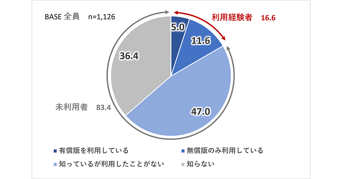 まず、生成AIの認知と利用経験について聞くと、知っている人(有償版を利用・無償版を利用・知っているが利用したことがない)は63.6%となった。一方で、実際に利用したことがある人は16.6%にとどまり、「知っていても利用していない」という人が半数近い結果となった。