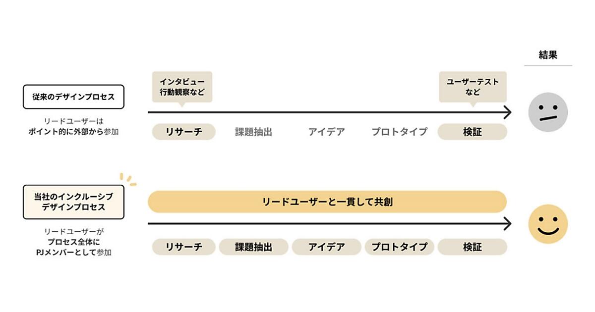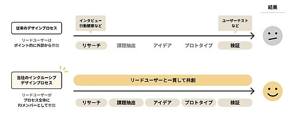 企業が多様性への対応に迫られ、デザインプロセスの対象から見過ごされてきた人々を巻き込むアプローチ「インクルーシブデザイン」が注目されていることに対応する。このソリューションは、課題意識と新しい視点を持つマイノリティの人たちを「リードユーザー」と定め、彼らのニーズを取り入れながら構想から開発まで一括して支援することが特長となる。