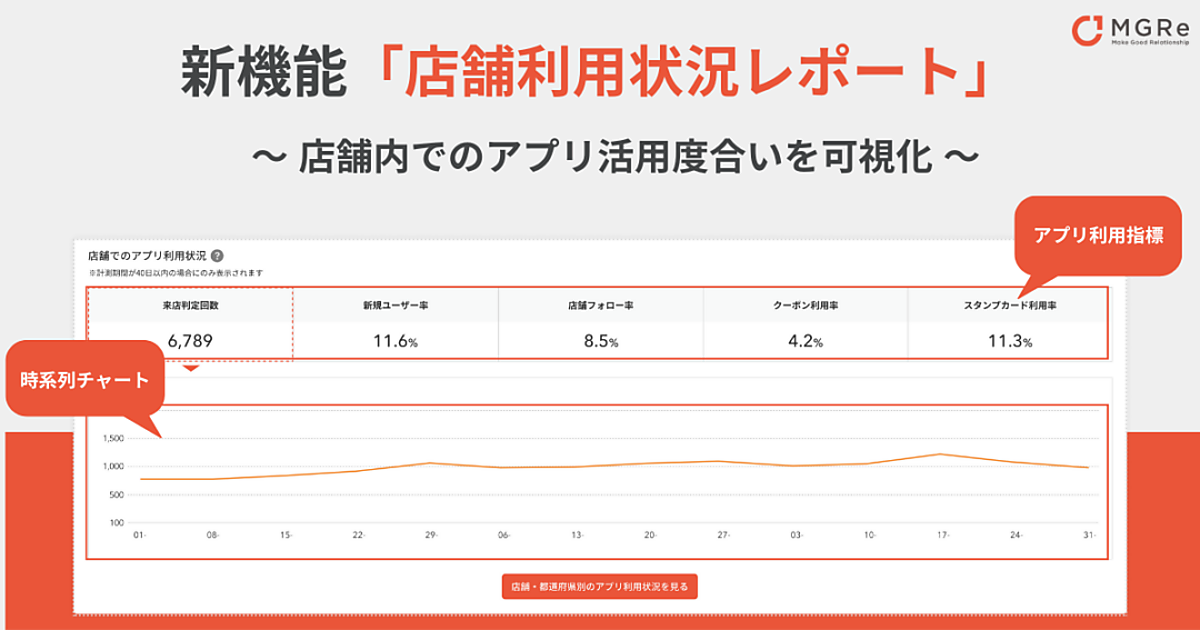 アプリマーケティングプラットフォーム事業のメグリは、同社が展開する同プラットフォーム「MGRe(メグリ)」に、新機能「店舗利用状況レポート」を搭載した、と12月14日発表した。管理画面から店内でのアプリの利用回数や、クーポン・スタンプカードなど店舗向け機能の利用率が把握できる。都道府県や店舗別に利用状況を比べることも可能。